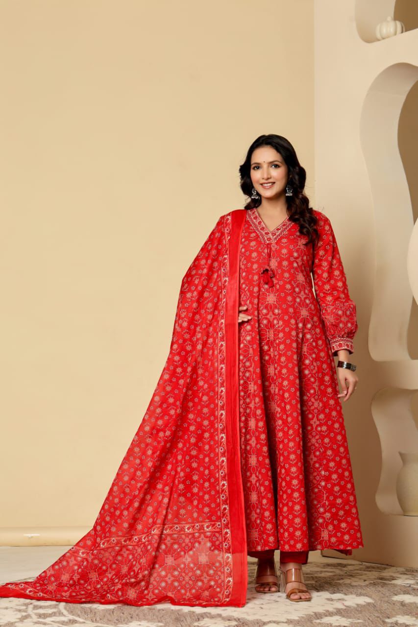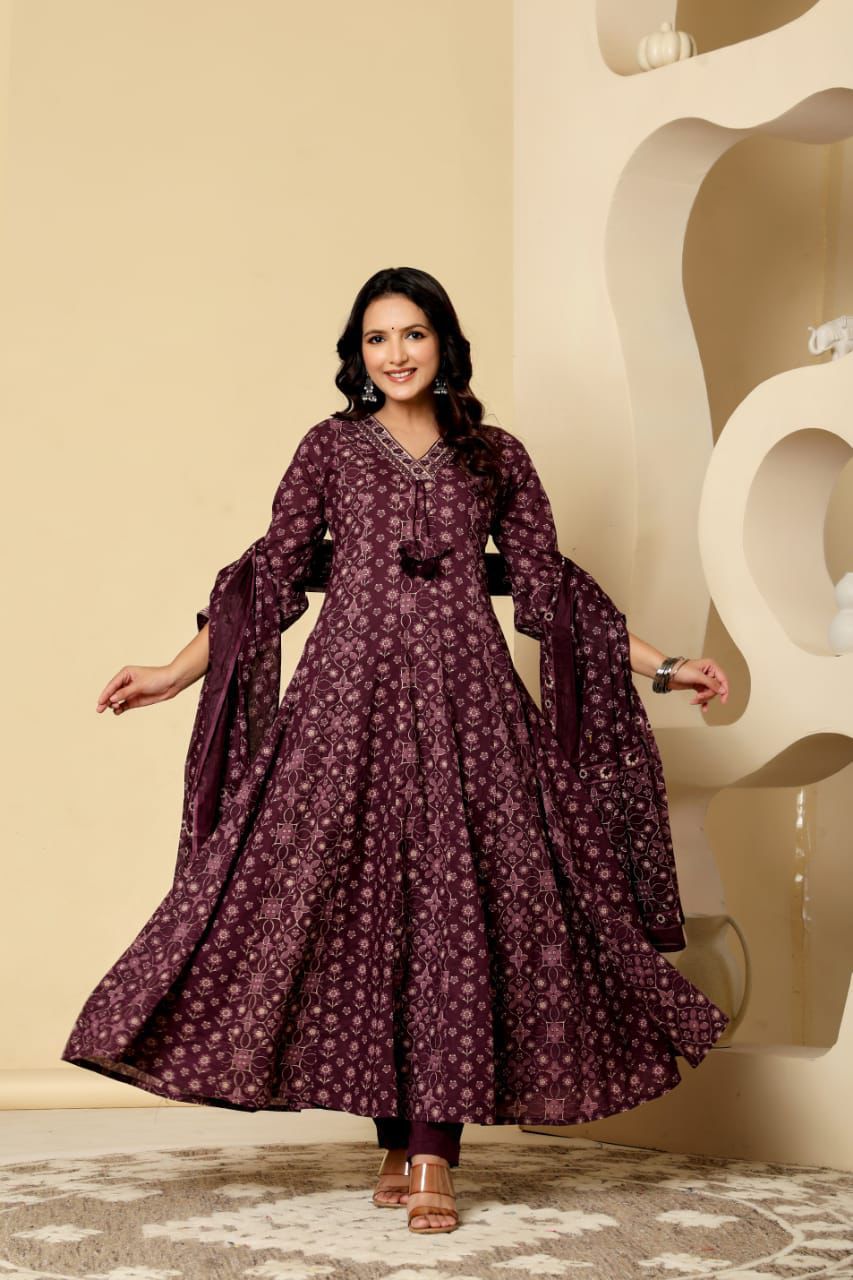 # A Line Anarkkali Cut Embrace timeless elegance with this beautifully crafted A-line Anarkkali salwar set, designed to flatter every silhouette. The graceful A-line cutting creates a flowing, flattering drape that moves with ease and comfort. Perfect for celebrations, gatherings, or everyday wear, this traditional design blends classic charm with contemporary appeal. Crafted from premium cotton for breathability and all-day comfort, this salwar set is an essential addition to any wardrobe seeking that perfect balance of tradition and modern style.