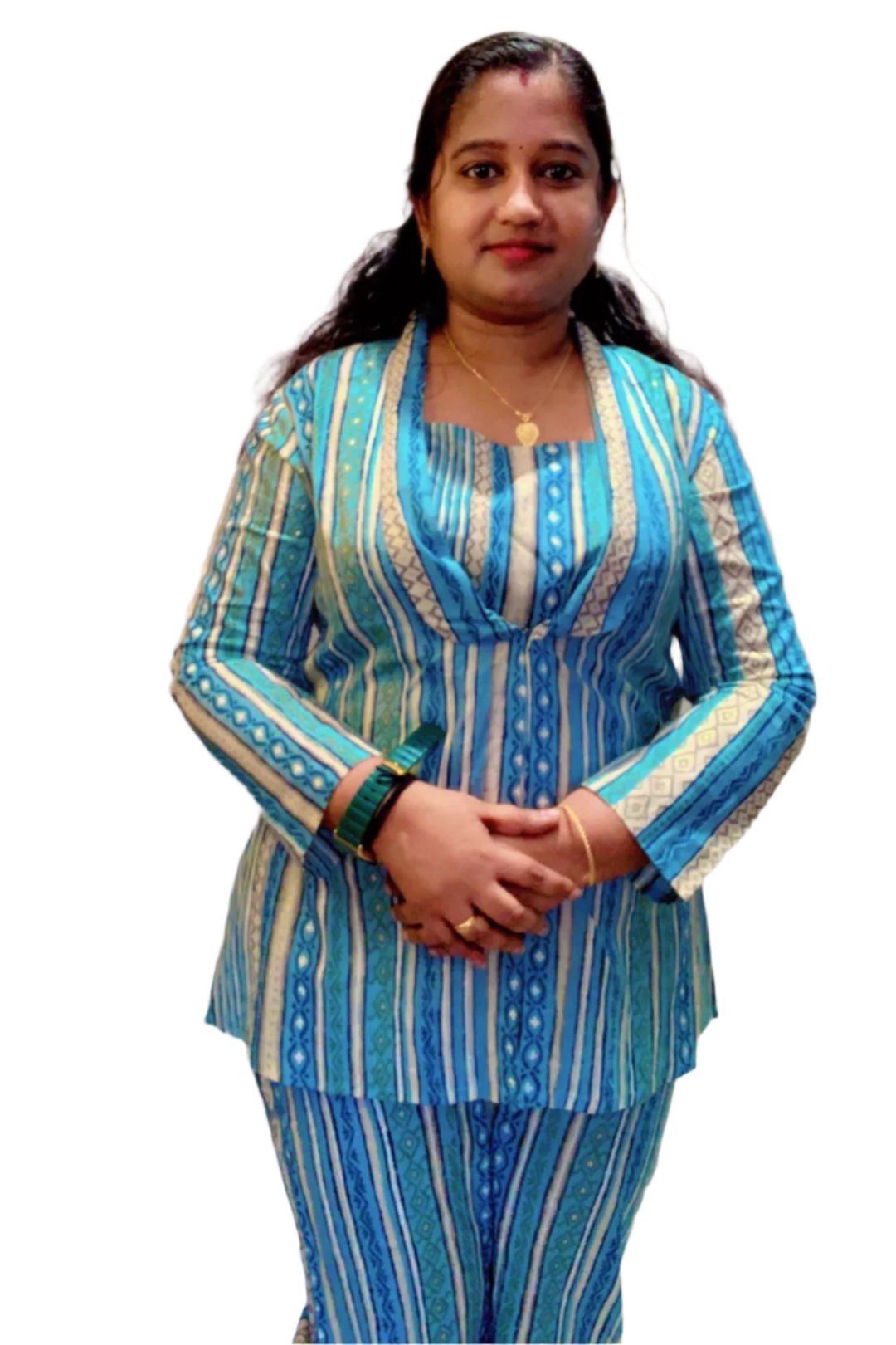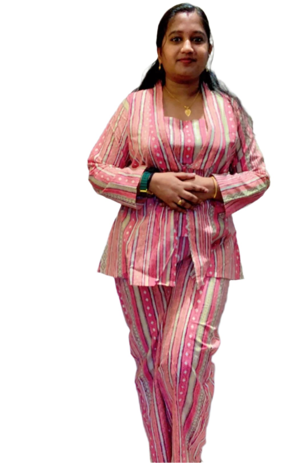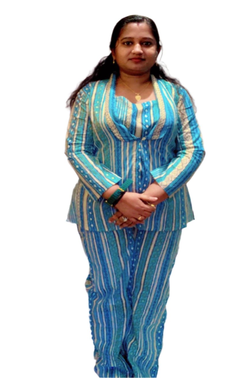 The image features set adorned in a blue and white striped women’s top. The garment showcases three-quarter sleeves, ruffles along the front opening, and a matching fabric accessory.