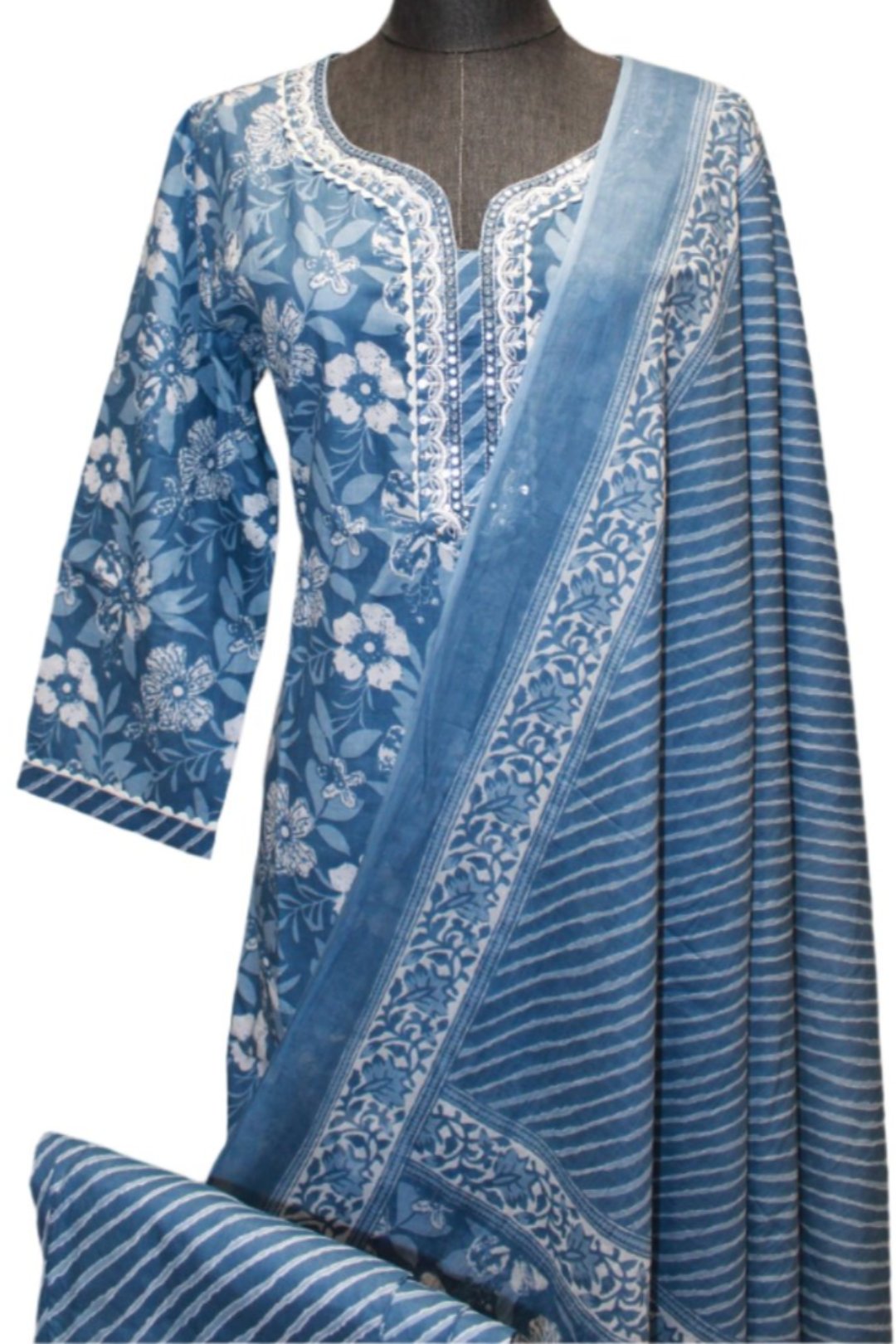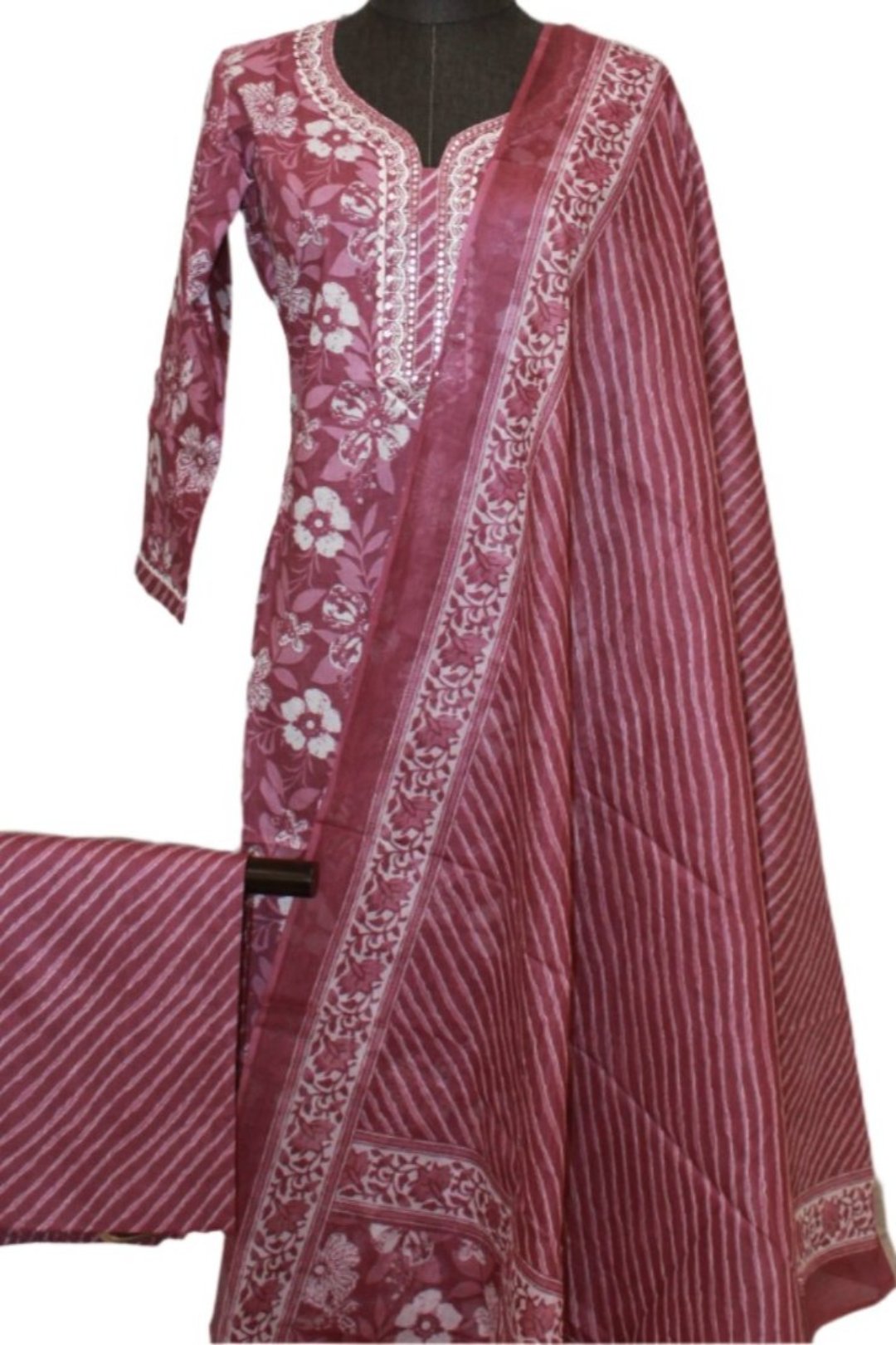 Upgrade your daily wardrobe with our versatile Cotton 3 piece Floral kurta set. Made with high-quality cotton, this onion pink set includes a cotton dupatta and straight fit bottom. The exquisite thread and mirror work on the neckline add a touch of elegance to this comfortable and stylish set. Perfect for everyday wear and sure to elevate your look.