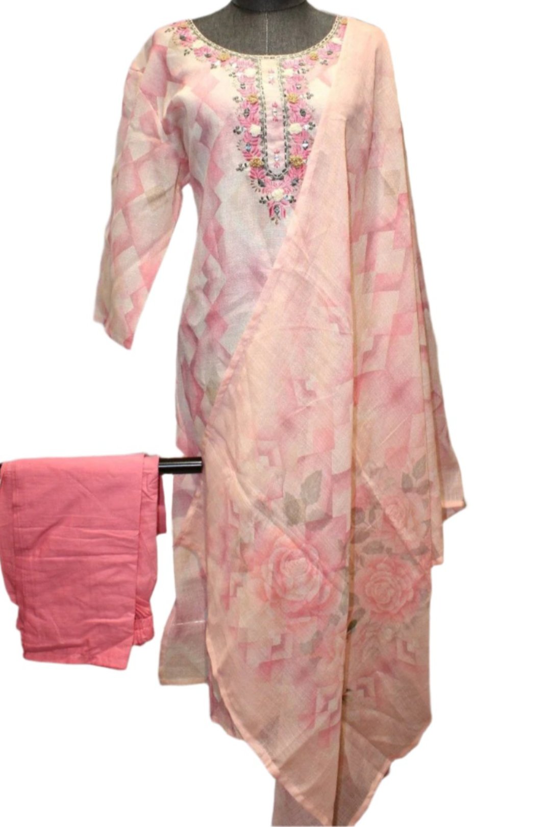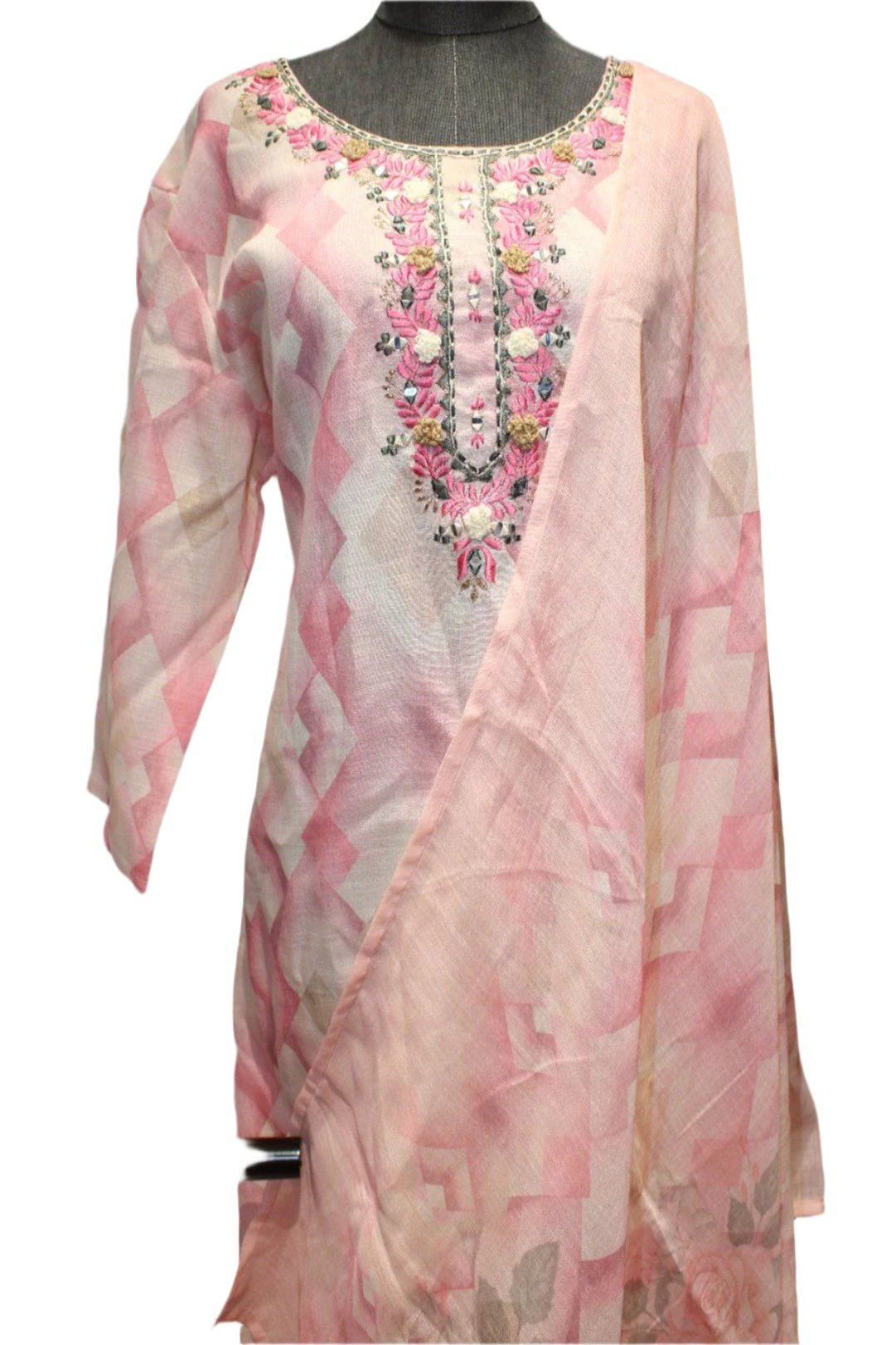 The kurti displayed in the image is a light pink one with a floral pattern..It features intricate embellishments around the neckline,consisting of pink and silver sequins,beads and embrodiary forming a vertical design.The full length sleeves appear to be sheer with the same floral pattern as the body.